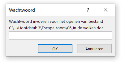 Om een digitale escaperoom te maken moet verschillende puzzels kunnen maken die je kunt versleutelen. Gelukkig zijn er meerdere mogelijkheden om dit te doen. In OneNote kan je pagina’s beveiligen met een wachtwoord. En bij Excel kan je tabbladen beveiligen. Het voordeel van het gebruiken van OneNote en Excel is dat je een escaperoom in een document kunt maken. Een nadeel van OneNote is dat het lastiger is om te delen. Het kan voorkomen dat de versleutelingen wegvallen als je het deelt met je leerlingen. Een PowerPointpresentatie en Word-document kun je beveiligen met een wachtwoord. Je doet dit door naar bestand te gaan en info te selecteren. Bij het eerste kopje kun je een wachtwoord toevoegen aan je document of presentatie. Als je gebruik maakt van PowerPoint of Word bestaat elke puzzel / opdracht uit een bestand dat beveiligd is. Tijdens het openen van het document moeten leerlingen een wachtwoord invullen (zie onderstaande afbeelding). Is het wachtwoord verkeerd dan moeten de leerlingen het document opnieuw openen om het juiste wachtwoord in te vullen.