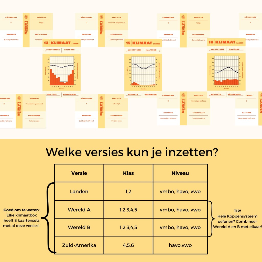 Box Klimaat is een klassenset met 8 kaartensets zodat je leerlingen in groepjes van 3 tot 4 personen kan laten werken. Elke kaartenset heeft vier verschillende versies met klimaatgrafieken, kenmerkenkaarten en hintkaarten. Het doel van de werkvorm is dat leerlingen leren klimaatgrafieken te analyseren waarbij ze de grafieken leren aflezen en het halfrond, de luchtstreek, het klimaat, het natuurlandschap en de locatie bepalen (atlasgebruik bij deze werkvorm is toegestaan!). Met uitbreidingen, verschillende niveaus en differentiatiemogelijkheden zodat de werkvorm breed inzetbaar is. Uiteraard afgestemd op de leerdoelen vanuit SLO en de vernieuwde syllabus vanuit het CvTE. Voor het gratis aanvullende lesmateriaal scroll naar beneden.