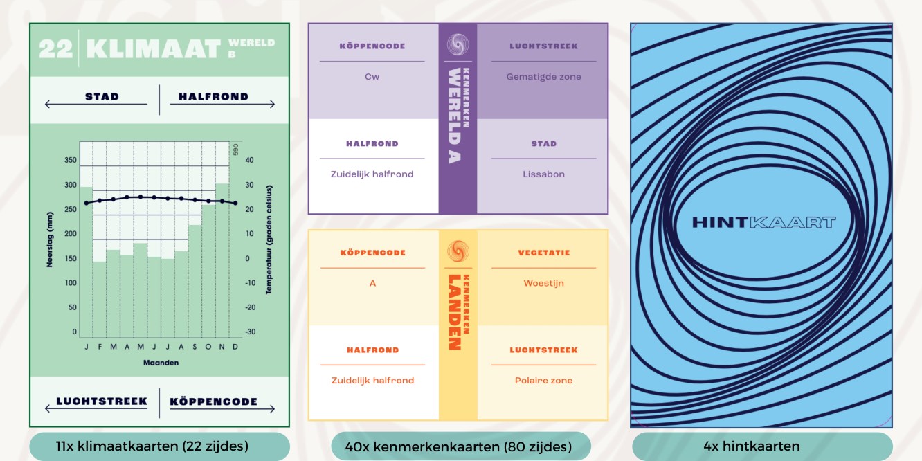Je kunt met elke kaartenset vier verschillende werkvormen spelen: klimaatanalyse, Wie ben ik?, klimaatdomino en landschappen herkennen. Op de site van EVEN-CENTRAAL wordt elke werkvorm kort uitgelegd. In deze post neem ik je even mee in de belangrijkste werkvorm: klimaatanalyse. Met de werkvorm klimaatanalyse kun je overigens weer met vier verschillende versies spelen, te weten: versie Landen (vmbo-havo-vwo voor klas 1 en 2), Wereld A en Wereld B (vmbo-havo-vwo vanaf klas 1) en Zuid-Amerika (havo-vwo klas 4,5 en 6). Goed om te weten: versie Wereld A en Wereld B kunnen worden gecombineerd zodat je een uitbreiding hebt en alle Köppencodes behandeld.