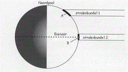 Zonnestralen schijnen recht / schuin op de evenaar en recht / schuin op de Noordpool. Zonnestralen op de evenaar verwarmen een kleinere / grotere oppervlakte dan op de Noordpool. Hierdoor geven zij meer / minder warmte. Dus hoe hoger de breedteligging, hoe kouder / warmer.